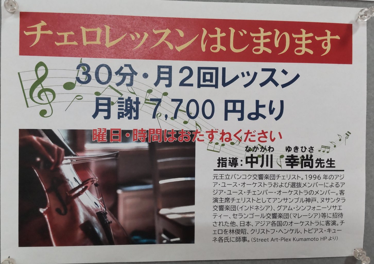 2003年から2018年まで王立バンコク交響楽団に所属、日本・アジア各国のオーケストラで活躍中のチェリスト中川幸尚先生を講師としてお迎えし、シュロアモール長嶺教室にて「チェロ教室」を開設しました!