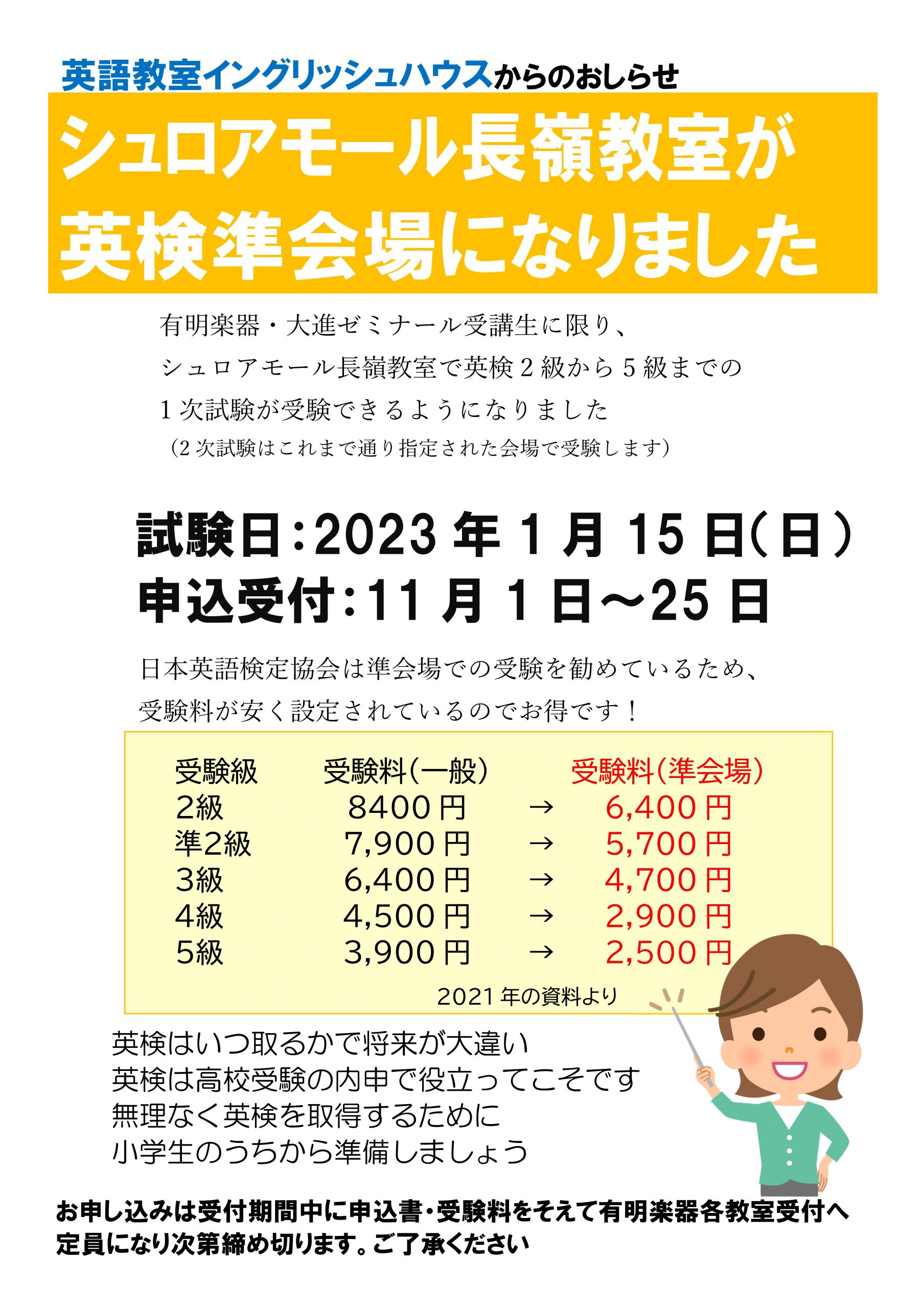 有明楽器又は大進ゼミナールの生徒さんに限り、有明楽器シュロアモール長嶺教室にて、英検2級~5級までの1次試験ができるようになりました。