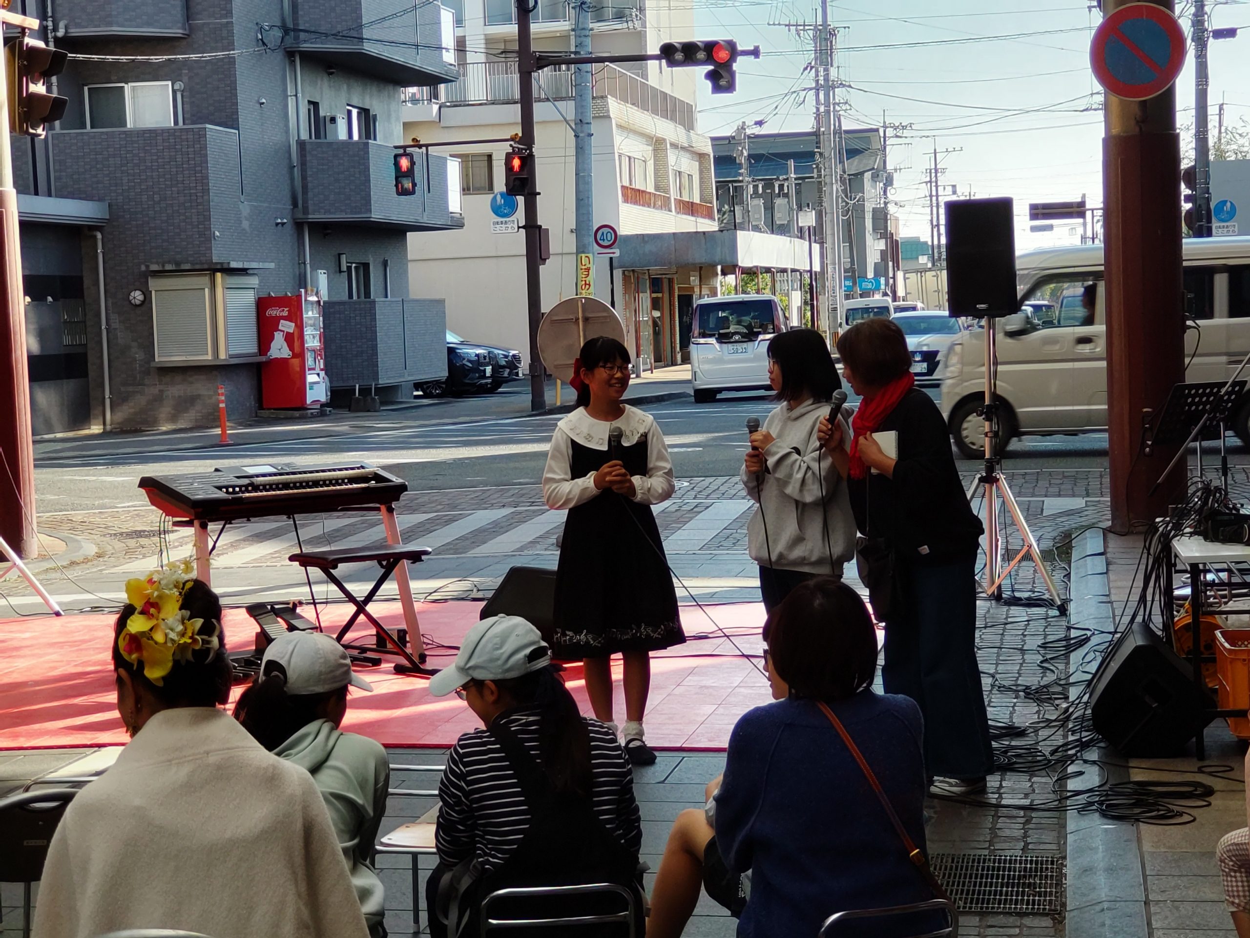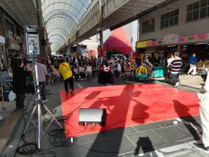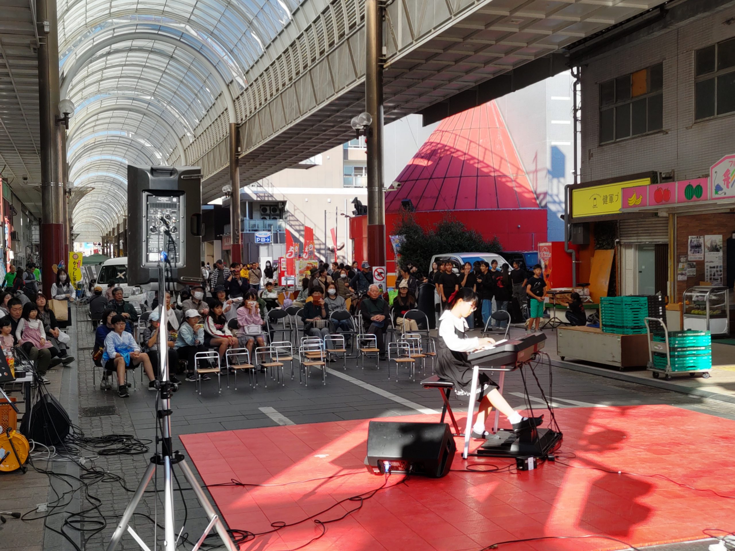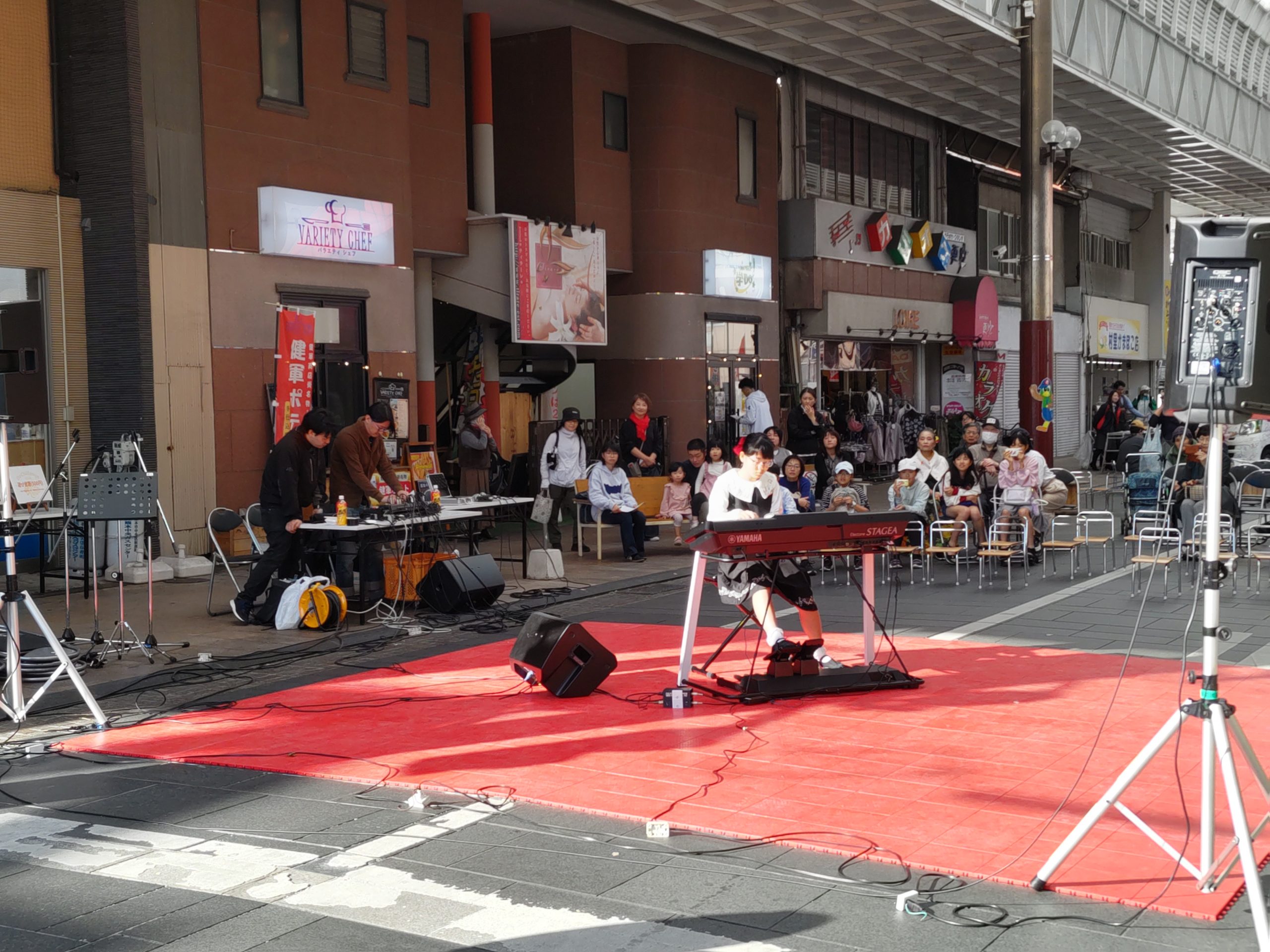 歩行者天国となった商店街に、 たこ焼き、インドカレー、プリンなどの食べ物屋さんや、物づくりや様々な体験をするワークっショップもあり多くの人々が集まる中、特設のステージで有明楽器生徒の靏田さんがエレクトーン演奏を行いました。