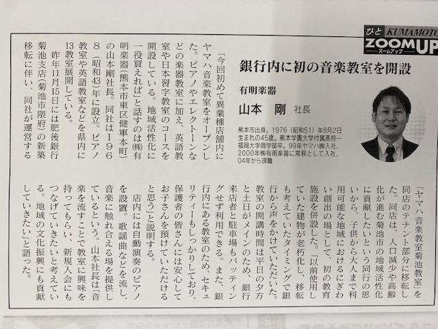 有明楽器 菊池教室が2021,11,肥後銀行 菊池支店テナント部分に移転オープン。