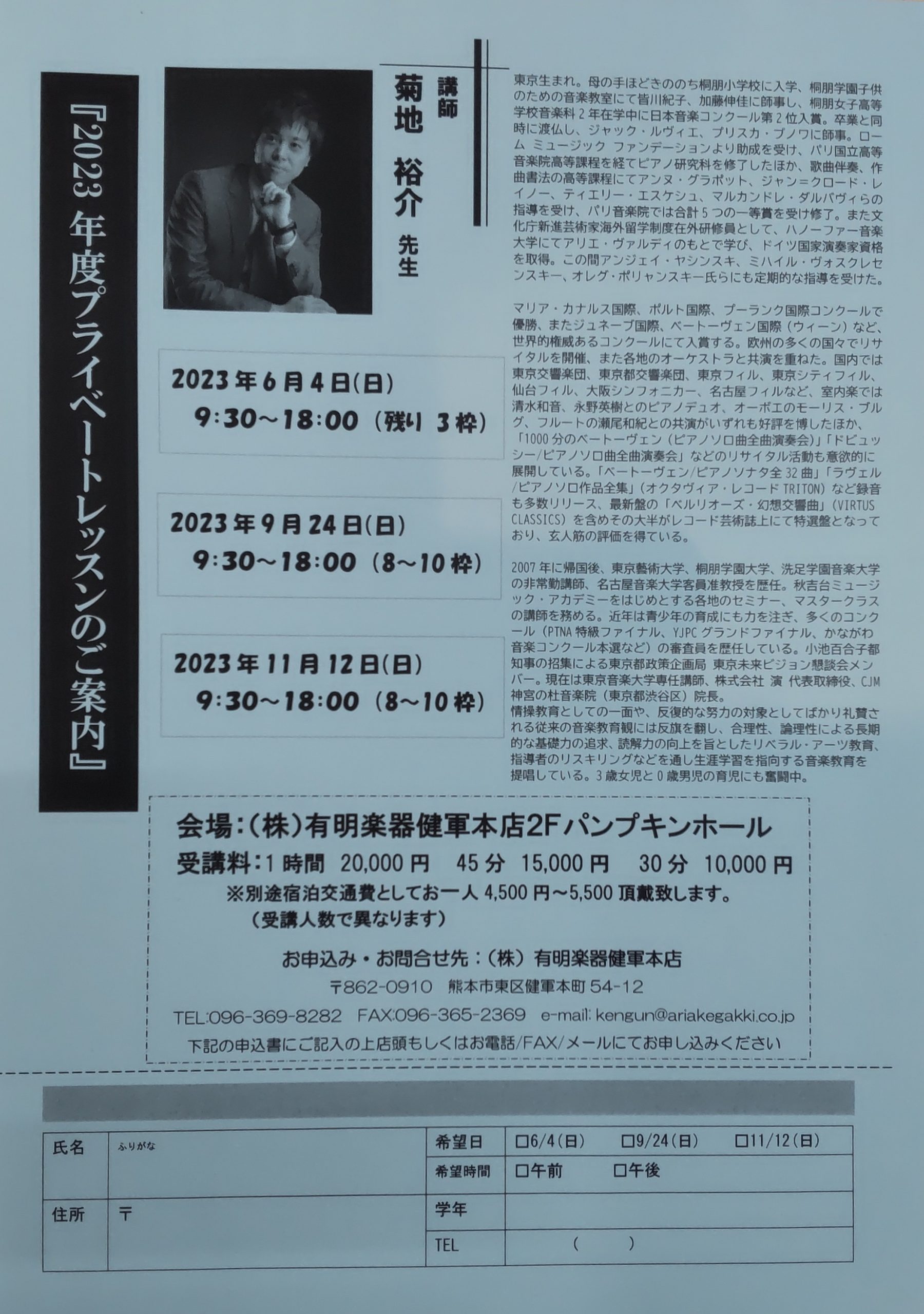 『菊地裕介先生によるプライベートレッスンのご案内』 投稿日 2023年5月17日 有明楽器健軍店では、演奏家としても指導者としても活躍中の菊地裕介先生によるプライベートレッスンを定期的に(年4回)開催しております。 近場では6月4日(日) ピティナ・コンペティション地区予選や、熊日1次予選対策に、間に合う日程となっておりますが、残り2枠ですので、ご検討中の方はお早めにご連絡をお願い致します。 『菊地裕介プライベートレッスン』 ・日時:2023年6月4日(日)午前中 ・場所:㈱有明楽器 健軍本店 (熊本市東区健軍本町54-12) ・問い合わせ:TEL 096-369-8282 DSC_1493
