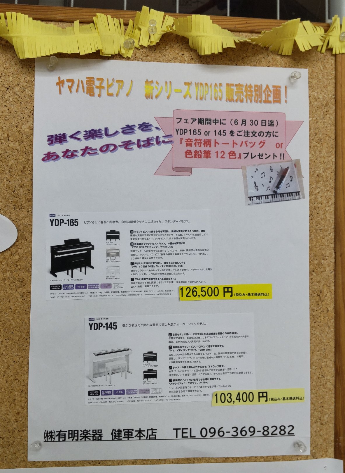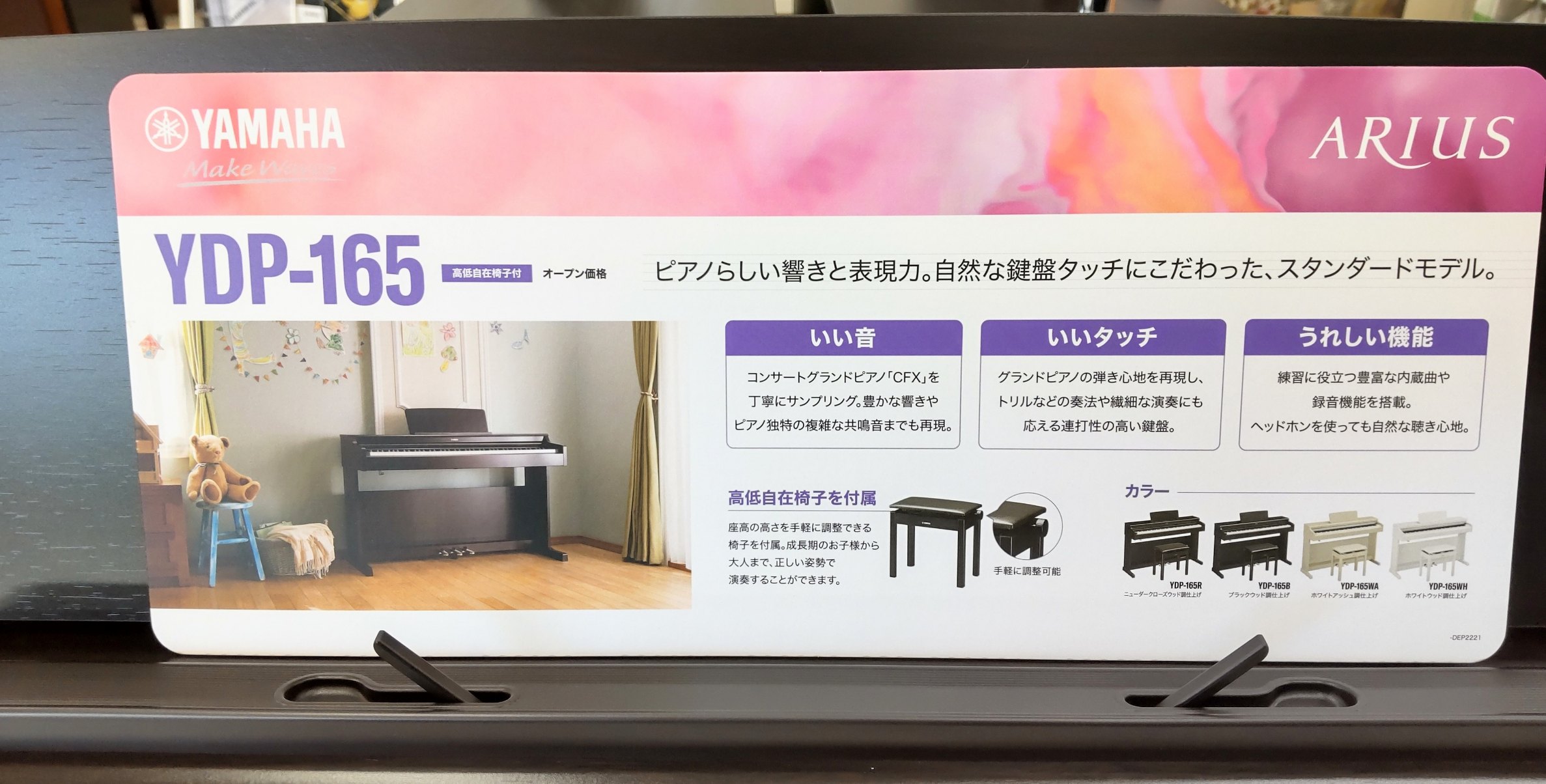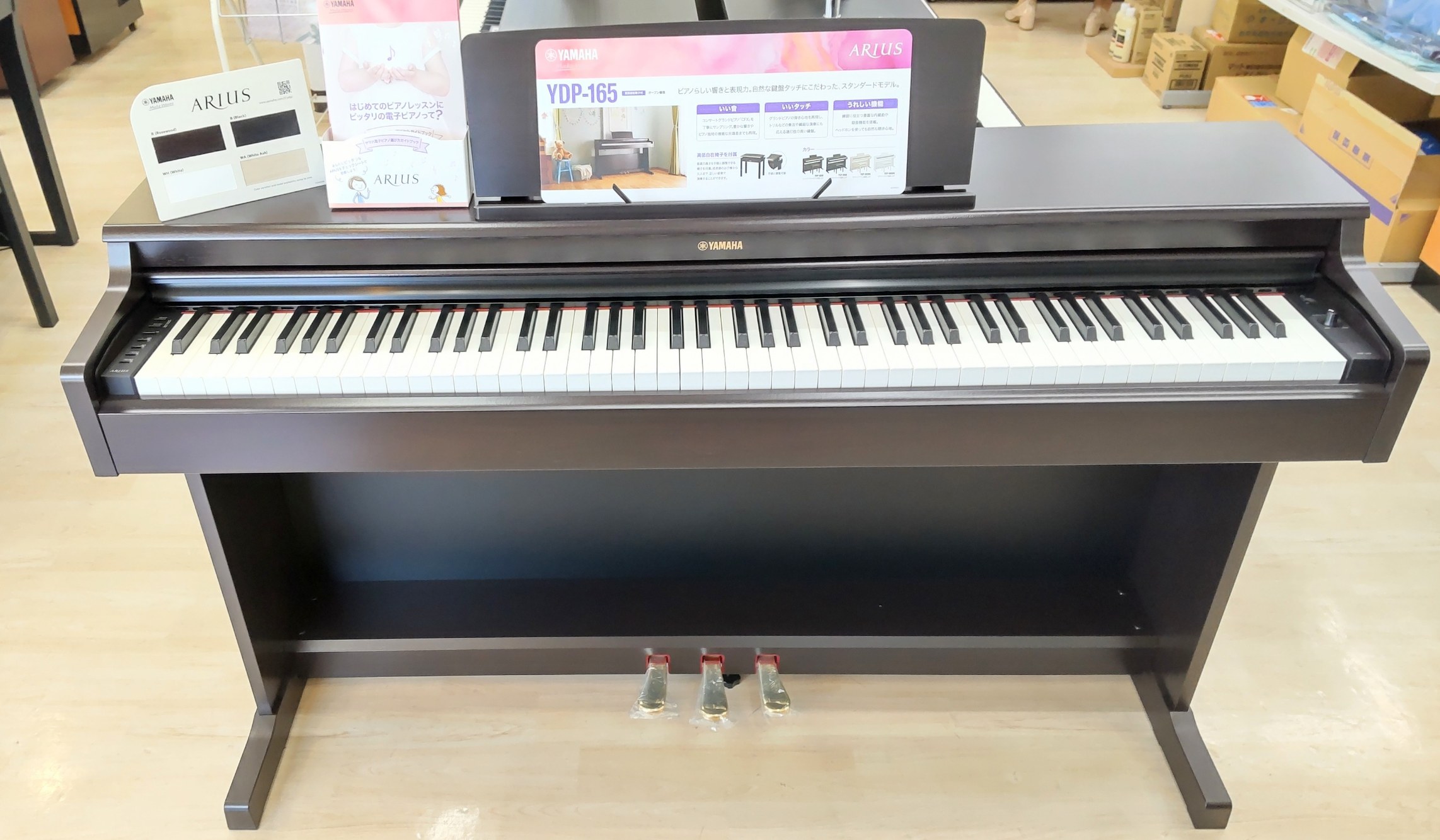 ヤマハ電子ピアノARIUS の新シリーズ『YDP165R』を展示しました♪ 投稿日 2022年4月30日 YDP165R(高低自在椅子/ヘッドフォン付)(色は、ダークローズウッド/ブラックウッド/ホワイトアッシュ/ホワイトウッドの4種類)126,500円(税込・熊本市内近郊運送料込) 今ご契約いただくと、『音符柄トートバッグ or 色鉛筆12色』をプレゼント! 『良い音』『良いタッチ』『うれしい機能』を、有明楽器健軍本店でご体感下さい!
