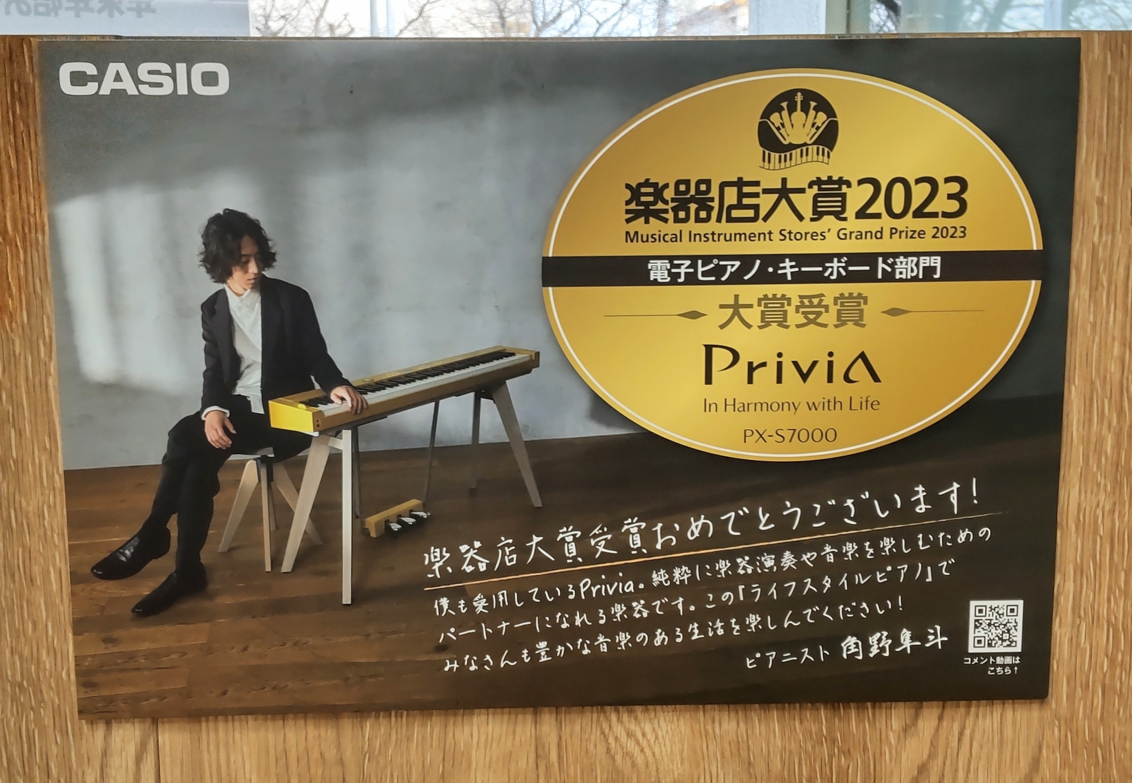 健軍店頭にPrivia PX-S7000を展示しました~🎵 投稿日 2023年12月26日 CASIO Privia PX-S7000(ハーモニアマスタードカラー)を健軍店頭入口にて展示しました~♪ここだけお洒落な異空間www このPX-S7000は、電子ピアノ・キーボード部門にて、2023楽器店大賞を受賞。 『かてぃん』こと、ピアニストの角野隼斗さんもご愛用、角野さんのメッセージ入りボードと、動画を流しております。 有明楽器健軍店に見に来てくださいね♪ DSC_1987 DSC_1988