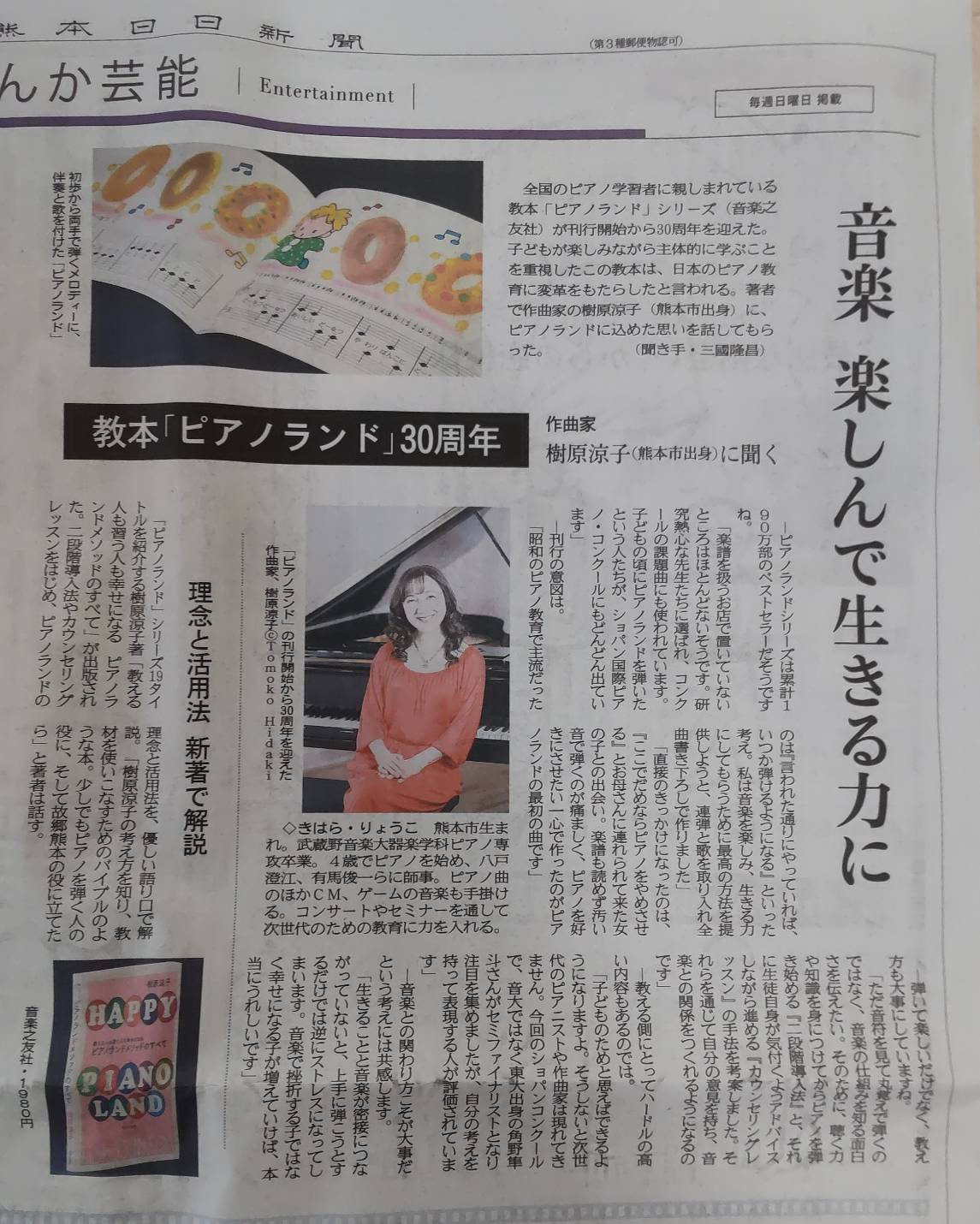 ピアノ教本の革命を起こしたと言われるピアノランドに込めた思いが、11月21日の熊本日日新聞に掲載されてました。