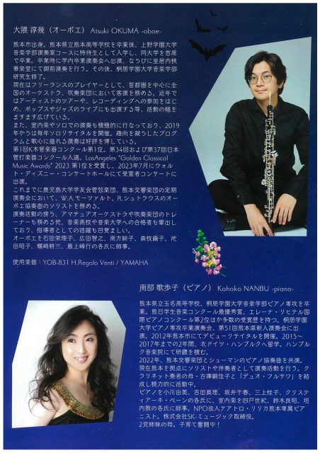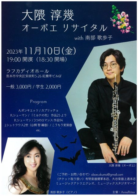 有明楽器卒業生のご活躍紹介1 大隈 淳幾 オーボエリサイタル 投稿日 2023年10月19日 有明楽器でヤマハ音楽教室ジュニア専門コースに通われていた大隈淳幾さんがオーボエニストとなって国内外でご活躍されています。 今回熊本でコンサートがありますので、どうぞ聴きにいらしてください。吹奏楽をされている方、特にお勧めです。プロの演奏をお楽しみください。 日時 2023年11月10日(金)19:00開演場所 ラフカディオホール(安政町 紅蘭亭ビル6F)チケット 一般3,000円 学生2,000円お買い求めは有明楽器健軍本店まで 有明楽器卒業生大隈淳幾さん演奏家としてご活躍中! 独特な音色をお楽しみください。