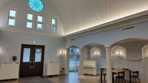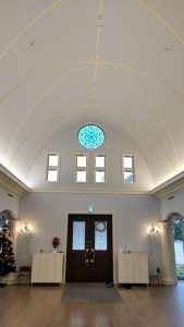 白と薄いブルーを基調とした内装で、丸い天井にステンドグラス…